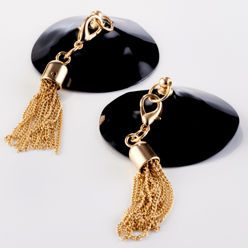 Coola självhäftande bröstsmycken gjorda av veganläder och nickelfria metalltofsar i guld som är avtagbara.