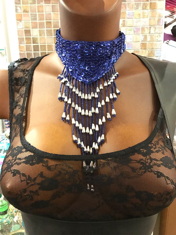 Halsband med paljetter och pärlor. Handgjorda så små skillnader sinsemellan kan förekomma.
